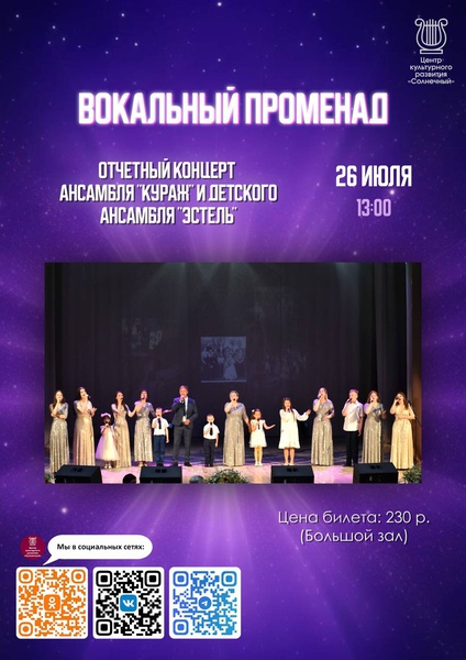 26 июля в 13:00 в Большом зале «Центра культурного развития «Солнечный» состоится отчетный концерт сразу двух вокальных коллективов. Вас ждут выступления: — Ансамбля «Кураж» — Детского ансамбля «Эстель» Стоимость билета: 230 рублей Доступно по Пушкинской карте!