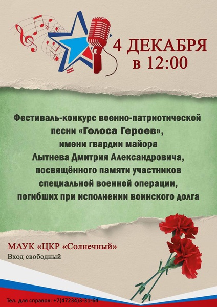 4 декабря 2024 года в помещении Центра культурного развития «Солнечный» состоится фестиваль-конкурс военно-патриотической песни «Голоса героев», названный в честь гвардии майора Дмитрия Александровича Лытнева.