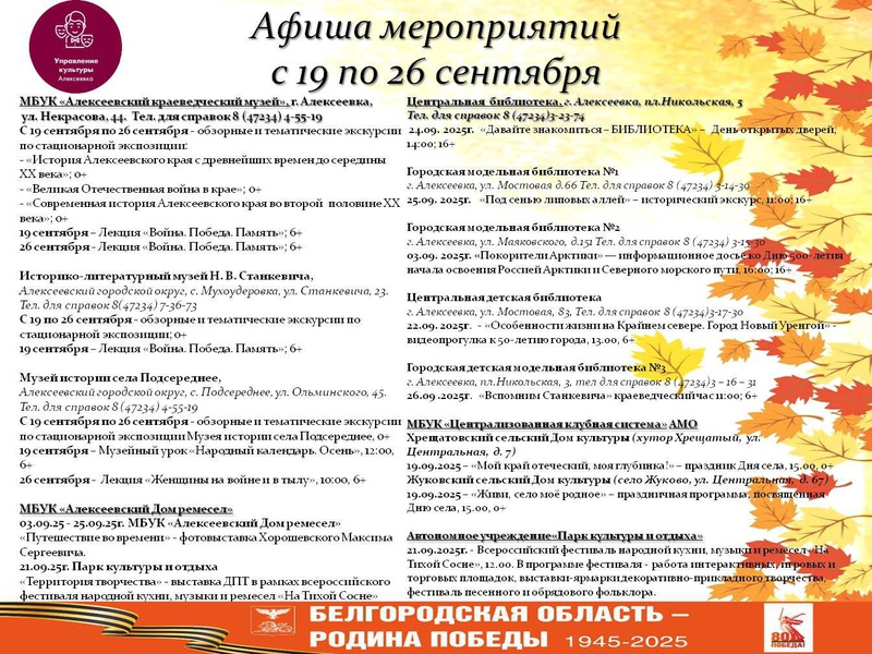 Осень — идеальный период для культурного отдыха и творческого вдохновения! Мы подготовили афишу событий, которые позволят каждому окунуться в мир музыки, истории и народных традиций. Обращаем ваше внимание, что 21 сентября в 12:00 Алексеевка готовится распахнуть свои объятия и щедро поделиться душевным теплом и богатством народных традиций! На набережной реки Тихая Сосна, что у Парка культуры и отдыха, развернется настоящий праздник души – фестиваль, пропитанный духом старины и народной мудрости. Присоединяйтесь к культурной жизни нашего города и подарите себе незабываемые впечатления этой осенью!