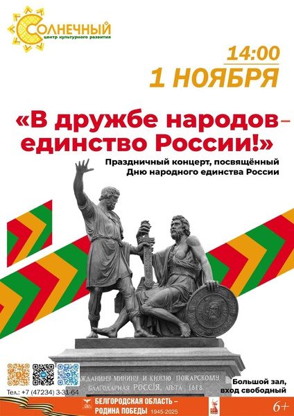 Приглашаем жителей и гостей города на концертную программу «В дружбе народов - единство России!», посвящённую Дню народного единства. Слово «единство» включает в себя многое: — заботу о нашей земле и памяти предков, — уважение к стране, в которой живём, — гармонию в семьях и любовь к близким, — воспитание детей и поддержку друг друга.