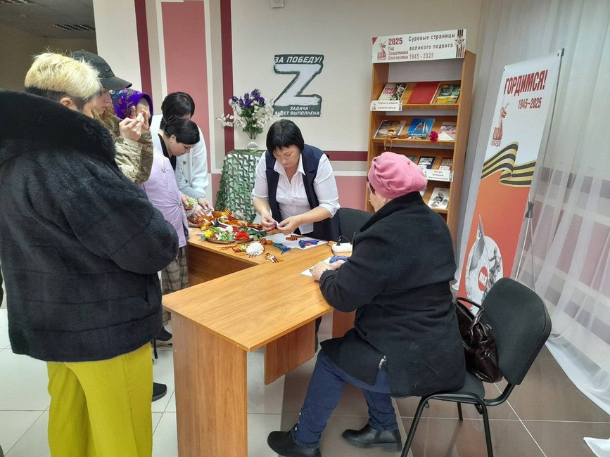 В фойе Красненского модельного Дома культуры собрались односельчане, чтобы ознакомиться с выставкой декоративно-прикладного творчества «Деревня мастеров» местных мастериц и изготовить броши из георгиевской ленты на мастер-классе.