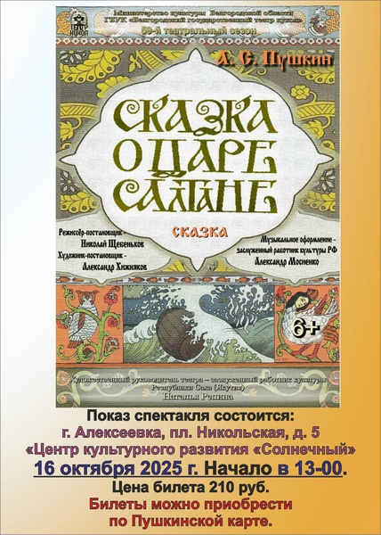 В Центре культурного развития «Солнечный» 16 октября в 13:00 состоится театральная постановка «Сказка о Царе Салтане». Стоимость билета: 210 рублей По всем вопросам обращайтесь по телефону: +7 (4722) 26-16-83. Не упустите возможность порадовать своих детей! Ждем вас в ЦКР «Солнечный»!