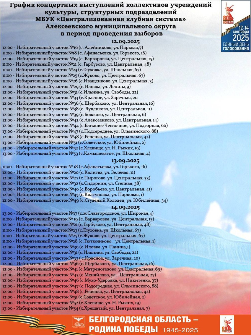 Приглашаем всех жителей принять участие в выборах и посетить концертные программы, организованные на избирательных участках. Мы уверены, что праздничная атмосфера сделают день выборов запоминающимся и приятным для каждого. Не упустите возможность стать частью этого события — приходите и поддержите выборы! Голосуй за будущее!