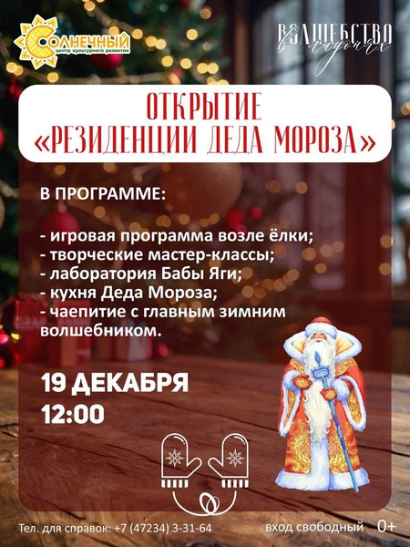 19 декабря в 12:00 — торжественное открытие «Резиденции Деда Мороза». Вас ждёт увлекательная игровая программа у ёлки, творческие мастер-классы, лаборатория Бабы Яги, кухня Деда Мороза и тёплое чаепитие с главным зимним волшебником. 20 декабря в 16:00 — открытие главной ёлки на Центральной площади. Вход на все мероприятия свободный. Приглашаем вас и ваших близких разделить с нами радость предстоящих праздников! Присоединяйтесь к праздничному настроению!