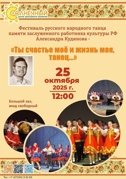 25 октября 2025 года в Центре культурного развития «Солнечный» состоится открытый фестиваль русского народного танца «Ты счастье мое и жизнь моя, танец…», посвящённый памяти выдающегося хореографа, педагога и заслуженного работника культуры РФ Александра Николаевича Кудинова. Фестиваль станет значимым событием, направленным на сохранение и развитие традиций русского народного танца, демонстрацию мастерства коллективов и воспитание интереса к народному искусству у зрителей всех возрастов. В программе — выступления разнообразных танцевальных коллективов, представляющих богатство и многообразие народных танцевальных традиций. Приглашаем всех желающих посетить этот праздник танца и поддержки культурного наследия, который объединит исполнителей и зрителей в тёплой атмосфере памяти и творчества. Вход свободный.