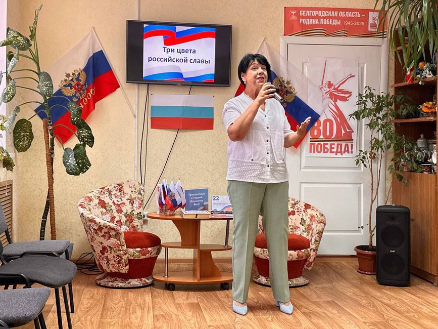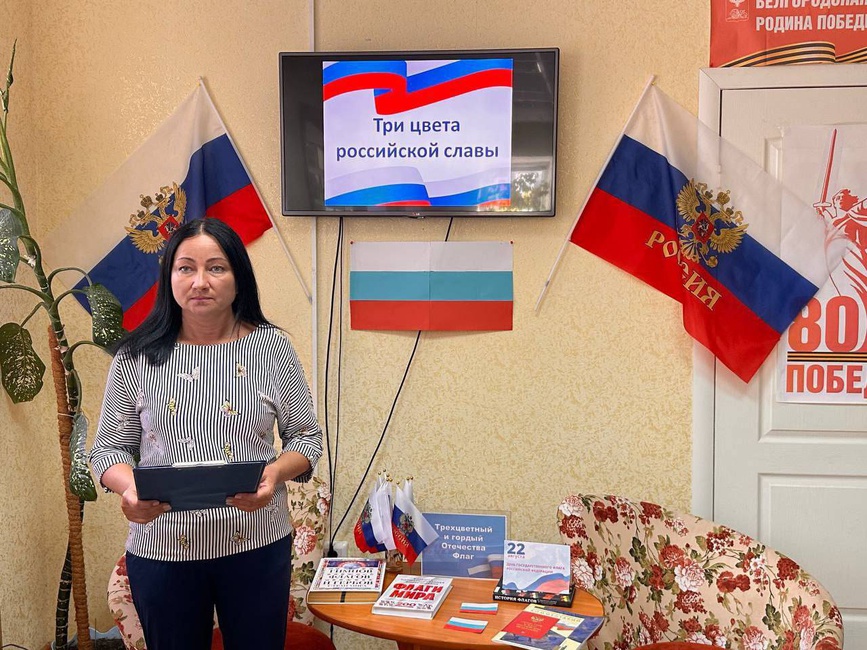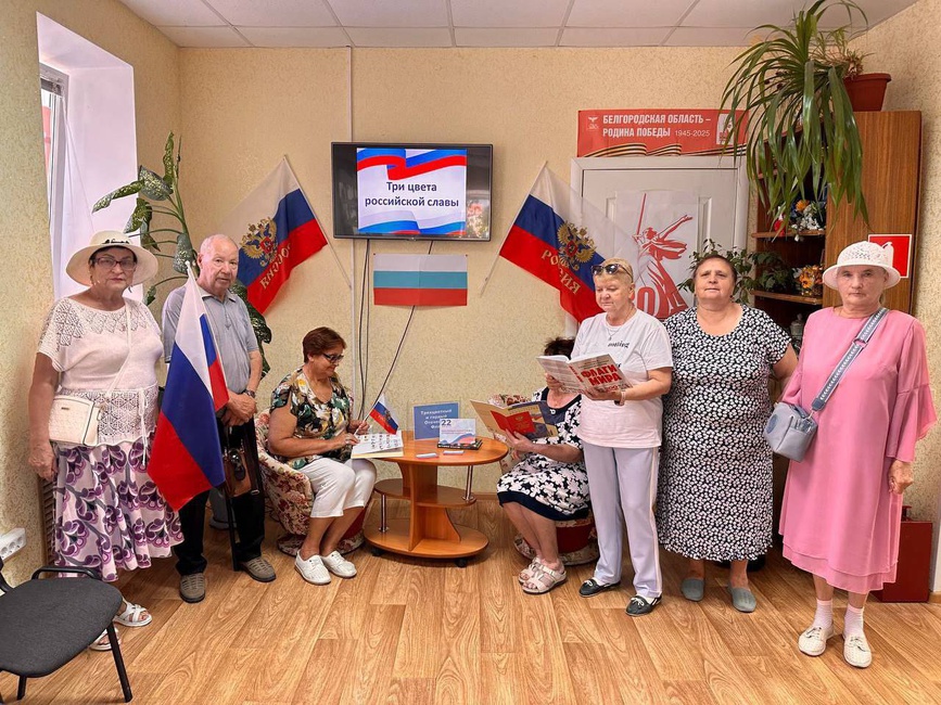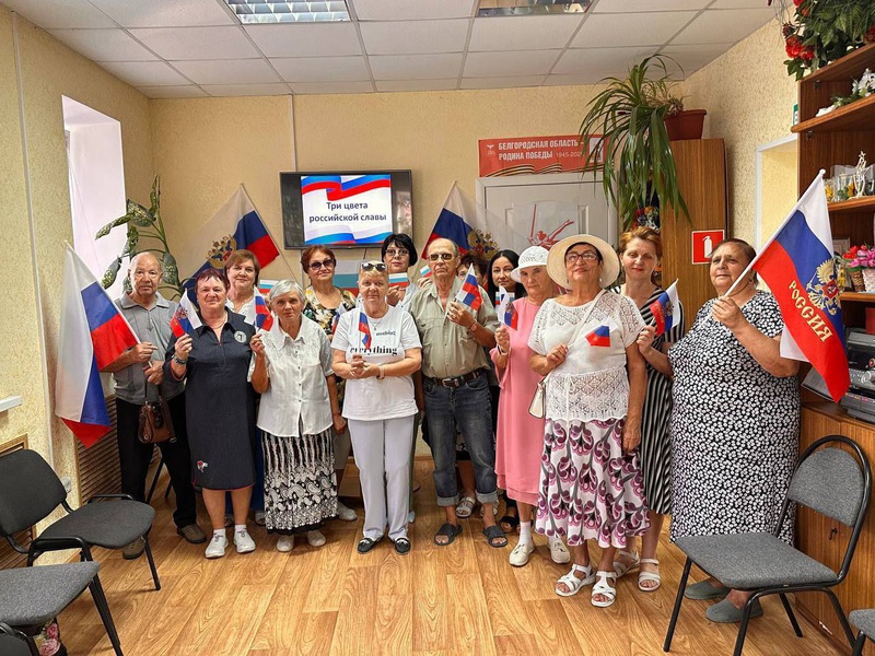 Сотрудники городской модельной библиотеки № 2 подготовили для участников комплексного центра социального обслуживания «Вдохновение» час гордости «Три цвета российской славы», приуроченный ко Дню Государственного флага Российской Федерации. Ведущая рассказала об истории праздника, какое значение имеют цвета флага и о значении Государственных символов России. Вниманию присутствующих был продемонстрирован видеоролик «Государственный флаг России - история, выбор, закон». В ходе мероприятия прозвучали стихи и песни о Родине и флаге России. Особый интерес вызвала выставка-событие «Трехцветный, гордый Отечества флаг».