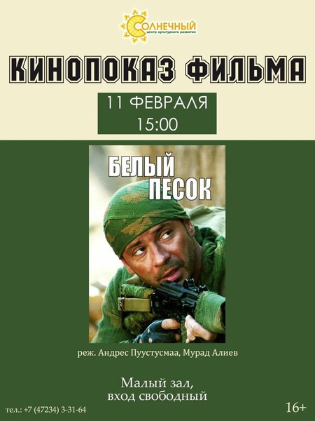 Дата: 11 февраля Время: 15:00 Место: Малый зал ЦКР «Солнечный» Афганистан, 80-е годы. Агент спецслужб СССР Александр Ветров на боевом задании попадает в плен к душманам. Выжить в таких условиях — почти невозможно. Но ему дают шанс на свободу: сопровождать огромный груз через все блокпосты. Цена жизни — опасный путь под прицелом врагов. Но ни Александр, ни бандит ещё не знают: произошла утечка информации. Спецслужбы СССР и США уже проводят совместную операцию, чтобы перехватить груз.