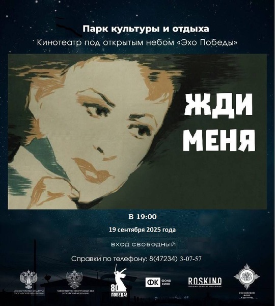 Сегодня, 19 сентября 2025 года в 19:00 на площадке кинотеатра под открытым небом «Эхо Победы» в парке культуры и отдыха состоится показ фильма «Жди меня» (1943 год). Фильм предоставлен к показу ФГУП «Киноконцерн «Мосфильм». Вход абсолютно бесплатный! Приходите всей семьёй и наслаждайтесь атмосферой настоящего кинематографического праздника!