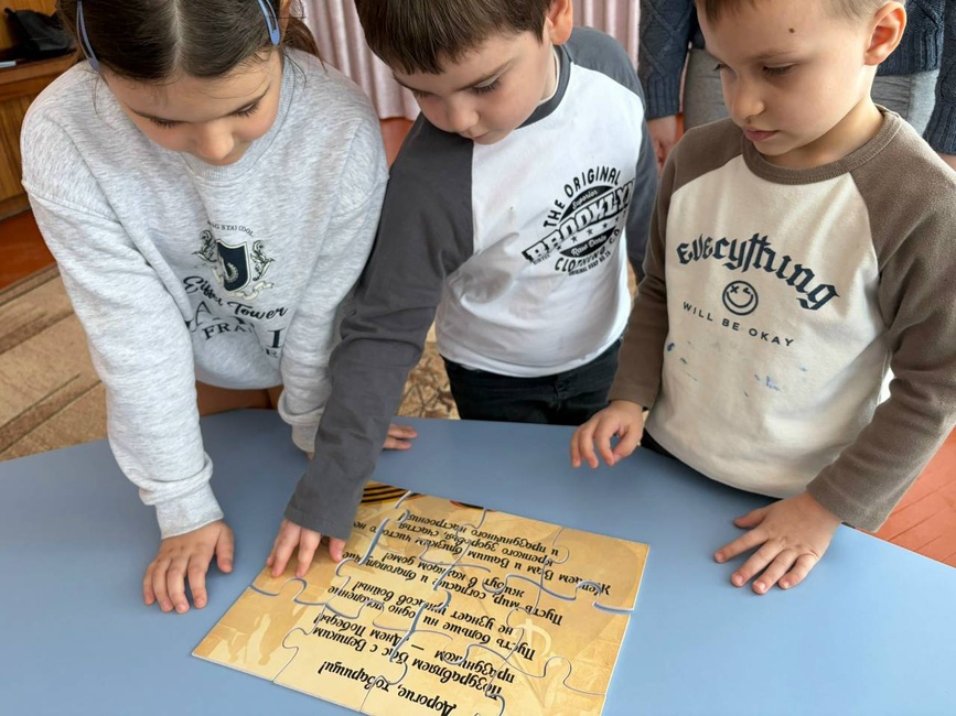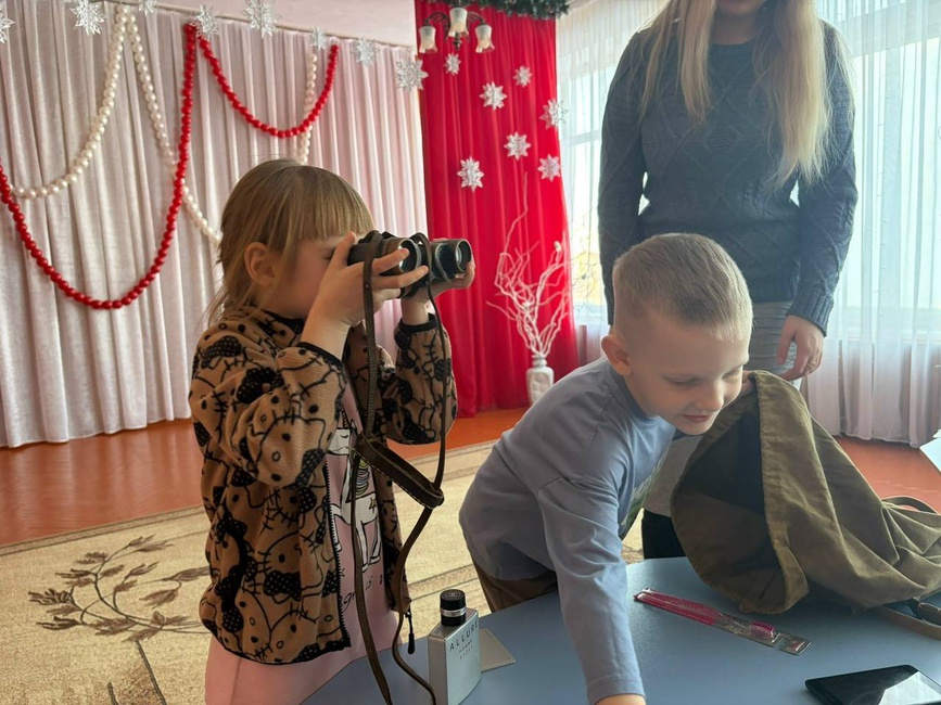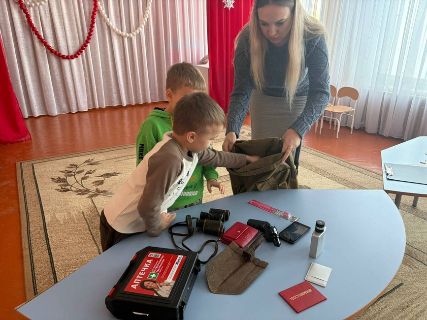 Дети с увлечением собирали пазлы, разгадывали тематические ребусы и загадки, а также поиграли в игру: пытались угадать, какие вещи разведчик берёт с собой в вещь‑мешок, и узнавали, для чего они нужны на фронте.