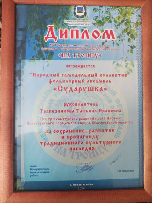 А так же как руководитель фольклорного коллектива «Воля» - постоянного участника Межрегионального фольклорного фестиваля «На родине Маничкиной», посвященного памяти заслуженного работника культуры РФ Маничкиной О.И. Глава Новоусманского муниципального района Татьяна Леонтьева отметила творческие коллективы, выступавшие на фестивале, дипломами, а после – приняла участие в составе жюри конкурса сельских поселений на самую вкусную кашу. На фестивале ожили старинные традиции. Гости смогли окунуться в атмосферу сельской жизни, ознакомившись с инсталляциями сельских подворий, каждое из которых представило свой уклад жизни. Особую романтику фестивалю придали «Троицкий хоровод» и обрядовое действие «Троицкий венок». Кроме того, 120 народных мастеров-умельцев представили на выставке свои работы. Фестиваль посетили свыше восьми тысяч человек.