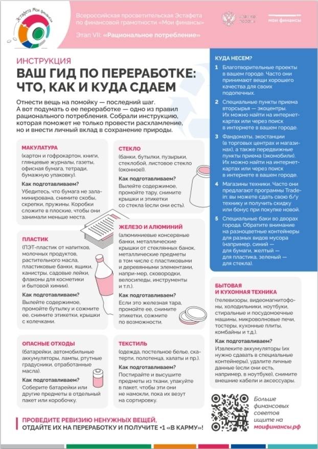 Напоминаем, что с 19 ноября 2025 года стартовал VII этап Всероссийской просветительской Эстафеты «Мои финансы» по теме «Рациональное потребление». Задачи проекта: 1. Создать единую площадку для коммуникации и обмена опытом всех регионов по теме финансовой грамотности; 2. Рассказать, как вести себя в сложных финансовых ситуациях и противостоять мошенникам; 3. Передать знания, умения и навыки безопасного пользования финансовыми продуктами, инструментами и технологиями; 4. Помочь каждому разобраться в личных и семейных финансах; 5. Сформировать элементы финансовой культуры у экономически активных людей, чтобы они смогли повысить уровень жизни своей семьи и общества. Всероссийская просветительская эстафета «Мои финансы» реализуется в рамках Стратегии повышения финансовой грамотности и формирования финансовой культуры до 2030 года. Эстафета традиционно помогает гражданам лучше ориентироваться в финансовых сервисах, формировать устойчивые модели поведения и эффективно защищать себя от мошенников. Ключевая тема VII этапа направлена на школьников, студентов, взрослое экономические активное население, пенсионеров и предпенсионеров (семьи). Тематическое наполнение этапа посвящено теме рационального потребления, сознательного распределения ресурсов для максимизации пользы и качества жизни. Мероприятия Эстафеты нацелены на информирование участников об экологичности и социальной ответственности рационального потребления, о прямой финансовой выгоде (экономии денег) и вкладе в сохранение ресурсов планеты от сокращения ненужных покупок, отказе от одноразовых вещей, сдаче одежды в секонд-хенд и сортировке мусора. В рамках VII этапа Всероссийской просветительской Эстафеты Вы узнаете: – «Как избавиться от ненужных вещей с пользой для банковского счета»; – «Рациональное потребление: быть или не быть…покупке»; – «Как не нахватать лишнего на распродажах: главный вопрос в магазине, который спасет вас от растрат»; – «Неожиданно списались деньги с карты? 3 шага, которые помогут этого избежать»; – «Рациональное потребление» для взрослой аудитории. ТОП-7 экопривычек, которые помогут сократить расходы своего кошелька и природных ресурсов: - Не покупать лишнего; - Продлевать срок службы вещей; - Узнать про идею капсульного гардероба; - Сохранять электричество; - Экономьте воду; - Не выбрасывайте продукты. Учимся отказываться от импульсных трат: 1. Каждый вечер анализируйте покупки за день; 2. Если сделали импульсную покупку вне вашего плана, зафиксируйте ее в соответствующих клеточках трекера; 3. Если день обошелся без спонтанных трат — оставляйте поля соответствующего дня чистыми.